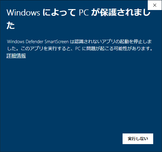 私が公開しているソフトの一部でWindows10でダウンロードしたファイルを開いたときに下の画像のような警告が出ることを確認しています